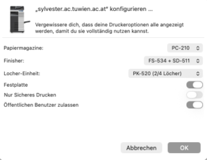 sudo lpadmin -p sylvester -D "KONICA MINOLTA bizhub 364e" -L "HB0402A copy/printer room" -v socket://sylvester.ac.tuwien.ac.at -m "KMbeuC364ux.ppd" -E